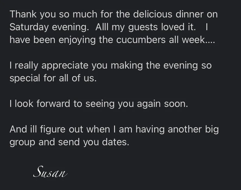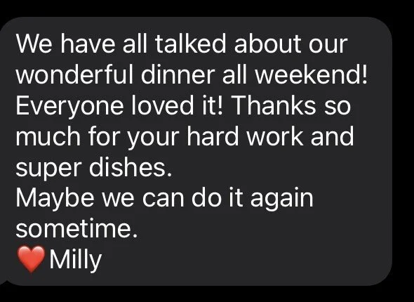 Chef will plan the menu, shop, travel, set up and clean up all food items and leave your kitchen as found. In house time averages 3-4 hours and she will help tidy the service items. If you need beverage service, please let Chef know and she can point you in the right direction. (Fees may apply)