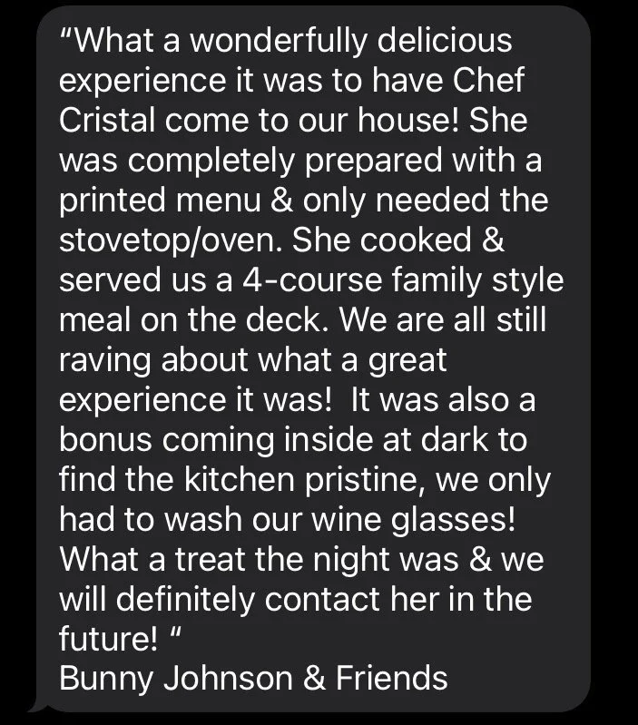 Let’s EAT together Name * First Name Last Name Email * Phone (###) ### #### Preferred Date MM DD YYYY Message * Thank you! Please allow 24-48 hours for Chef Christal’s response. check us out on instagram!